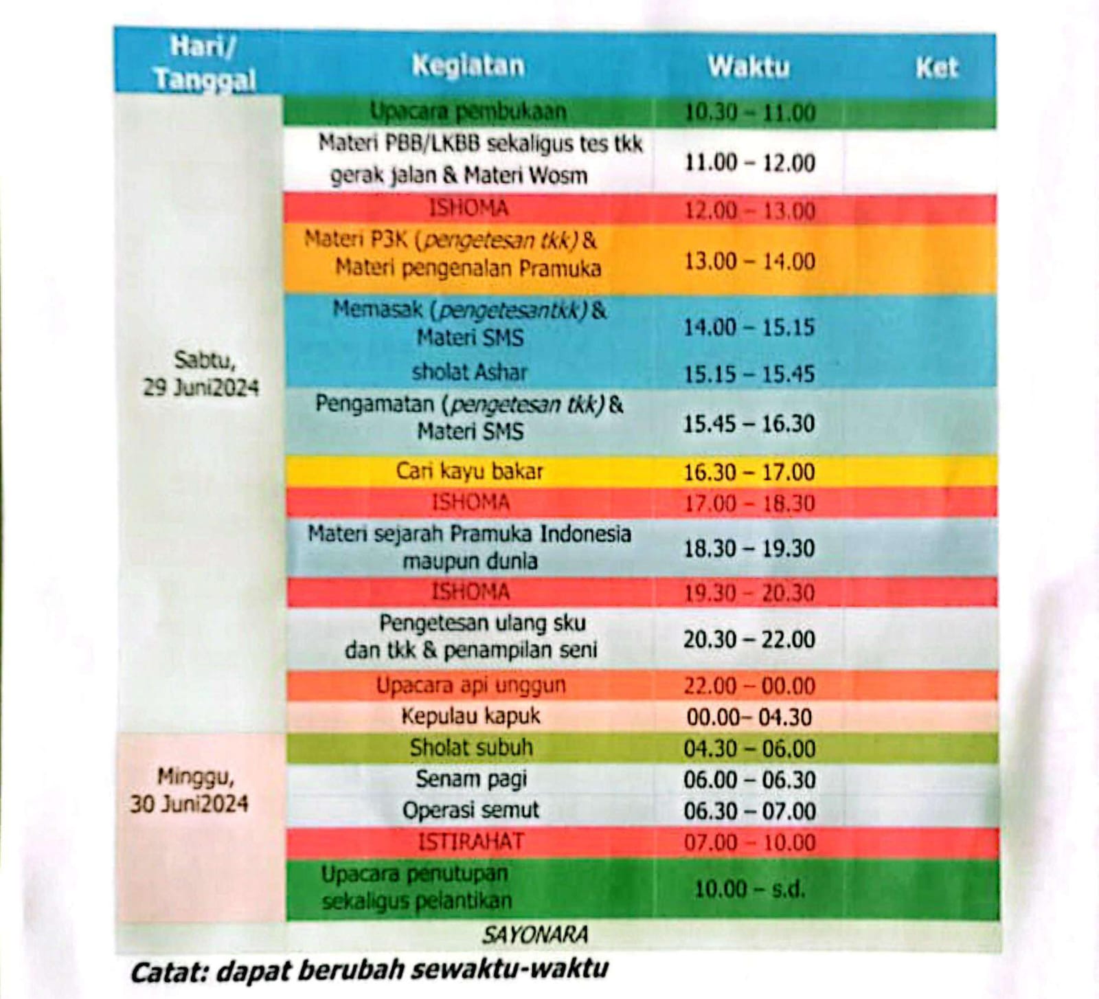 Selama Persami, siswa mengikuti kegiatan seperti upacara, permainan edukatif, lomba kepramukaan, api unggun, dan pembinaan akhlak. Dengan bimbingan guru dan pembina pramuka, peserta diajak untuk belajar hidup sederhana, saling tolong-menolong, serta mencintai alam dan sesama.