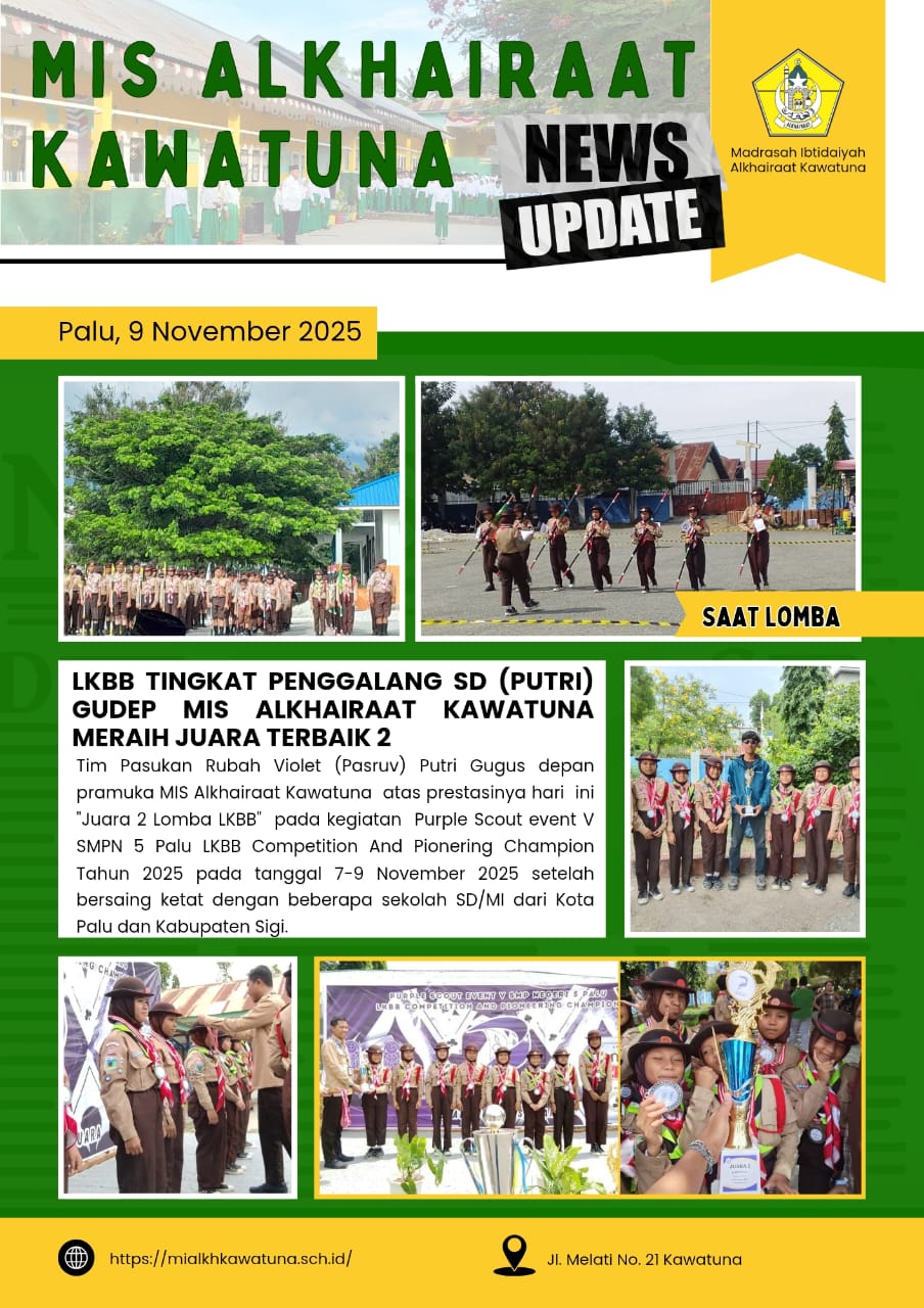 Gudep MIS Alkhairaat Kawatuna kembali menorehkan prestasi membanggakan. Tim LKBB (Lomba Keterampilan Baris-Berbaris) Putri Tingkat Penggalang SD berhasil meraih Juara Terbaik 2 pada ajang Purple Scout Event V yang diselenggarakan oleh SMP Negeri 5 Palu.