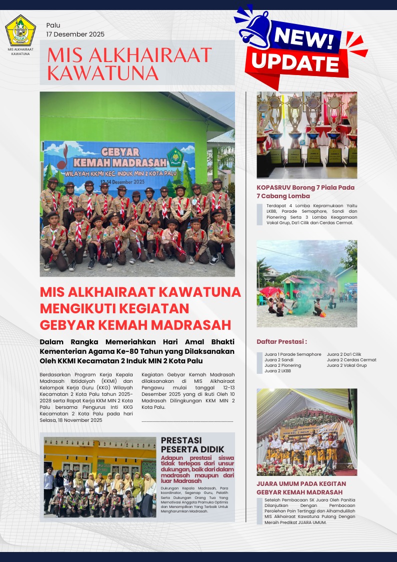 Gudep MIS Alkhairaat Kawatuna turut berpartisipasi dalam kegiatan Gebyar Kemah Madrasah yang diselenggarakan oleh KKMI Kecamatan MIN 2 Kota Palu yang dilaksanakan di MIS Alkhairaat Pengawu pada Bulan Desember Tahun 2025. Kegiatan ini diikuti oleh 10 Madrasah Ibtidaiyah se-Kecamatan MIN 2 Kota Palu sebagai ajang silaturahmi, pembinaan karakter, serta penguatan nilai-nilai kepramukaan dan keagamaan bagi peserta didik.